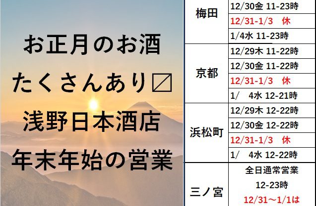 お正月のお酒はぜひ日本酒で!年末年始の各店は上記の日程で営業しております。立ち飲みバーも営業しております。雄町しております♪…