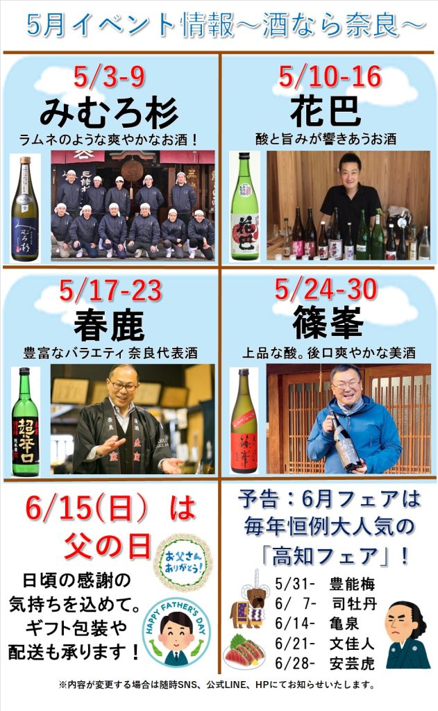 ※三ノ宮店の花巴フェアは5/9金~、春鹿フェアは5/16金~、篠峯フェアは5/23金~となります。
